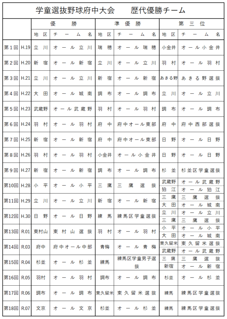 第18回学童選抜野球府中大会組合せ・試合時間決定